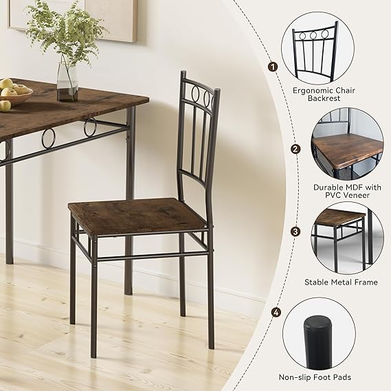 - 【Comfort & Safety Prioritized】: The chair’s reclining backrest has been ergonomically designed to offer optimal support for your back, providing comfort during prolonged sitting. Besides, every corner of our kitchen table set is rounded, minimizing the risk of injuries in the event of accidental collisions. Moreover, the dining chairs are equipped with non-slip foot pads that enhance stability.