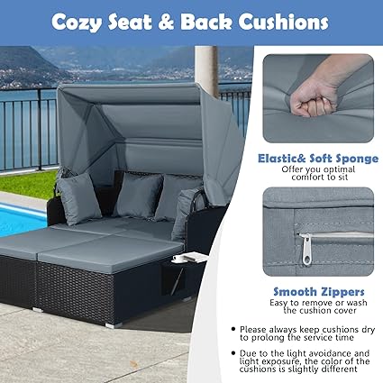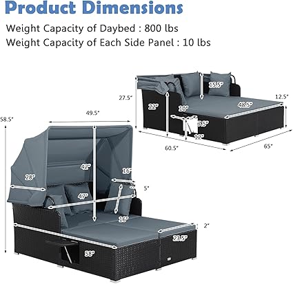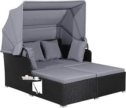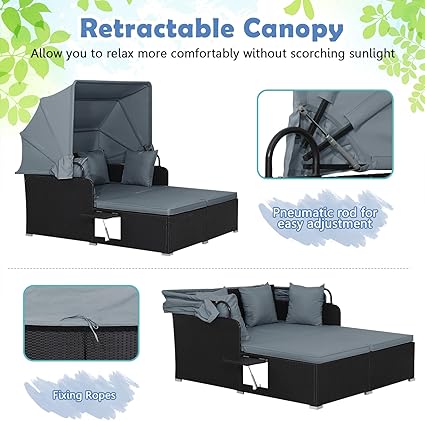 - [Versatility & Convenience]: Featuring a retractable canopy for better protection from the sun and 2 trays with pneumatic rods on both sides, this wicker daybed is perfect for outdoor relaxation and keeping your drinks within reach.