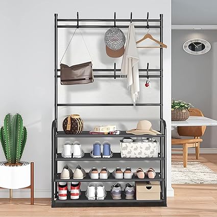 • 【Entryway Shoe Rack】It’s ideal for the entrance, bedroom, closet, or dorm. The upper hooks are convenient for hanging hats, clothes, and other things. The bottom 4 shelves are used to store your shoes, up to 20 pairs of shoes.