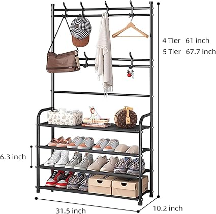 • 【Easy Assembly】Product dimension: L x W x H: 31.5 x 10 x 61 inches. Featuring 4 tiers shoe racks with coat rack for entryway.