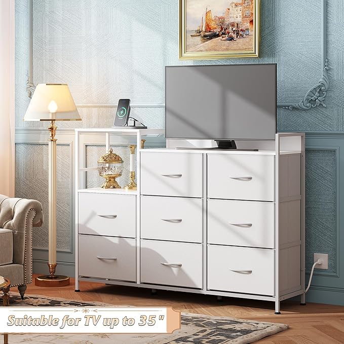 WLIVE White Dresser TV Stand for Bedroom with Charging Station and Open Shelves, Fabric Dresser with 8 Drawers and Wood Top, Wide Storage Chest of Drawers for Living Room, Hallway