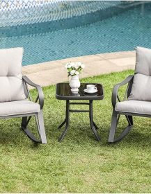 ✅【 Ergonomic Rockers 】: Combining elegance with durability these classic dark gray powder-coated, rust-resistant steel rockers with color-fast all-weather poly-fiber warm gray cushions will last for years in harsh weather extremes. The set comes with a matching glass top side table for a light snack while you rock and chat. Relaxing weekends and evenings on…
